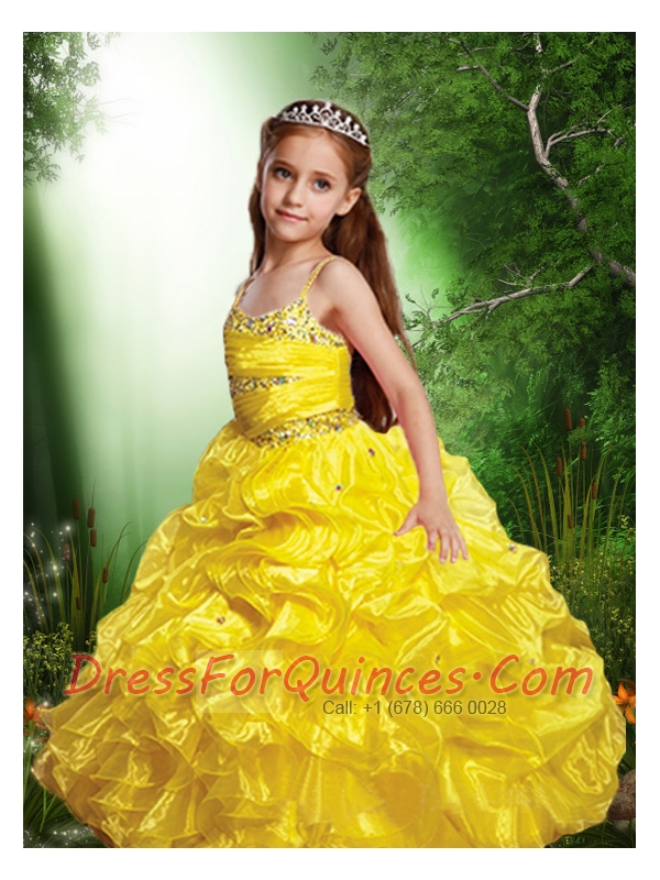 Yellow Spaghetti Straps Beading Little Girl Pageant Dress with Ruffle for 2014