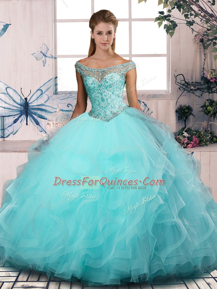 Comfortable Sleeveless Tulle Floor Length Lace Up Vestidos de Quinceanera in Aqua Blue with Beading and Ruffles