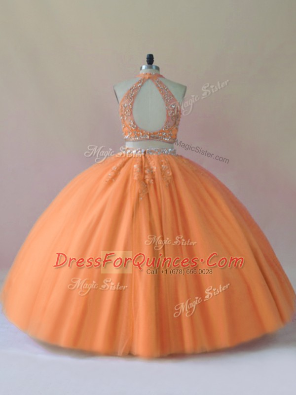 Custom Design Orange Tulle Backless Halter Top Sleeveless Floor Length Quinceanera Dresses Beading