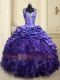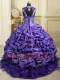 Custom Design Purple Ball Gown Prom Dress Military Ball and Sweet 16 and Quinceanera and For with Beading and Ruffles and Pick Ups Straps Cap Sleeves Brush Train Lace Up