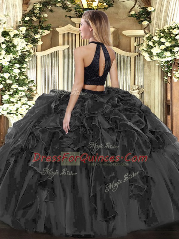 Fashion Turquoise Backless Halter Top Beading and Ruffles 15 Quinceanera Dress Organza Sleeveless