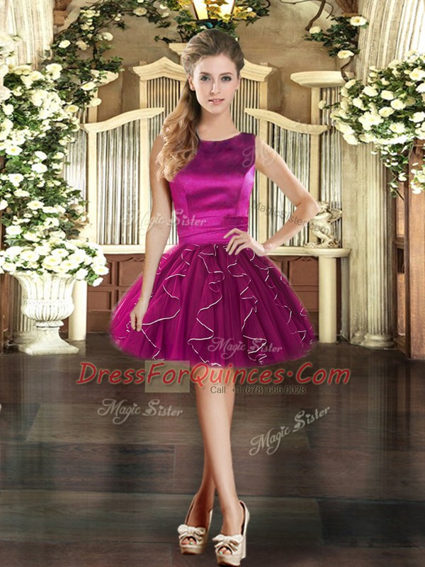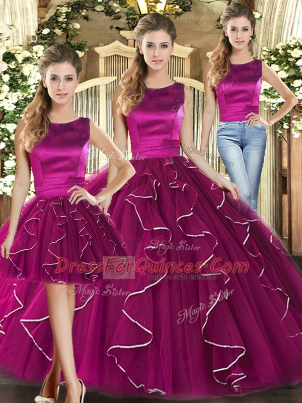 Floor Length Fuchsia Quinceanera Gowns Tulle Sleeveless Ruffles