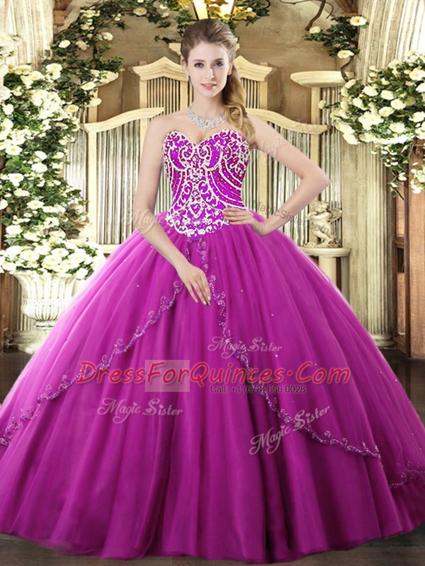 Fuchsia Sleeveless Brush Train Beading Sweet 16 Dresses