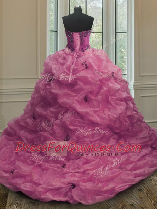 Fuchsia Sleeveless Court Train Beading and Appliques and Pick Ups With Train Quinceanera Gowns