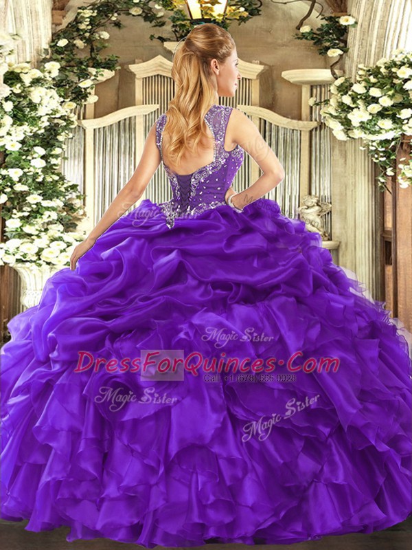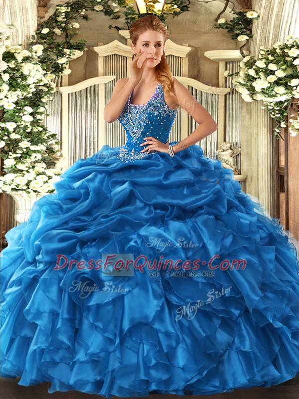 Gorgeous Blue Ball Gowns Straps Sleeveless Organza Floor Length Lace Up Beading and Ruffles and Pick Ups Vestidos de Quinceanera