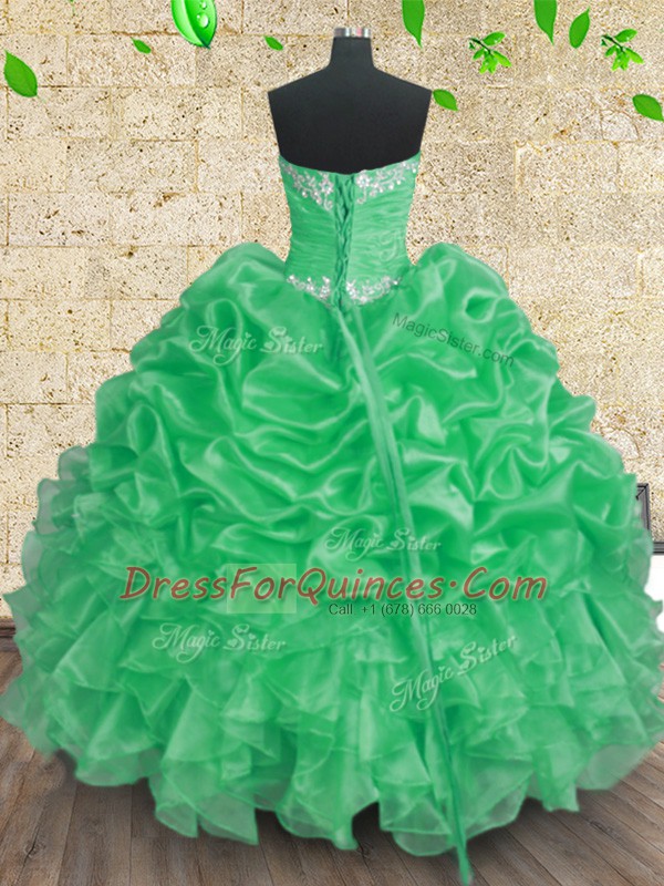 Green Organza Lace Up Sweet 16 Quinceanera Dress Sleeveless Floor Length Beading and Appliques and Ruffles and Ruching