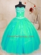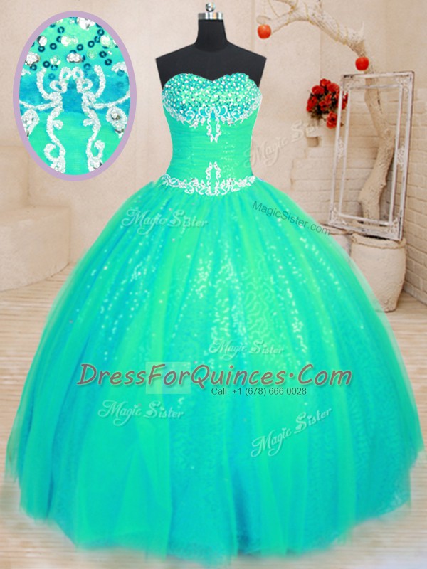 High End Sleeveless Tulle and Sequined Floor Length Lace Up Sweet 16 Dress in Turquoise with Beading and Appliques