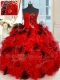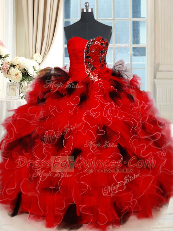 Inexpensive Floor Length Lace Up 15 Quinceanera Dress Black and Red for Military Ball and Sweet 16 and Quinceanera with Beading and Ruffles and Sequins