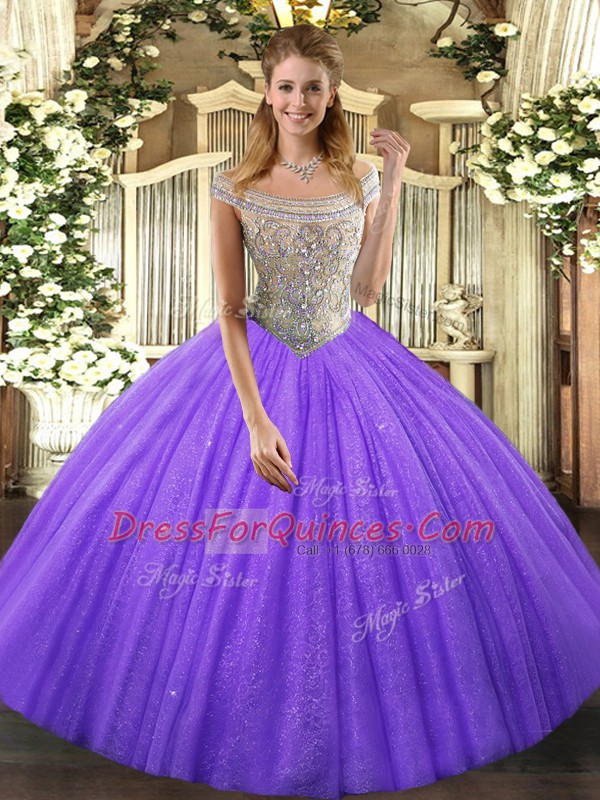 Lavender Tulle Lace Up Quinceanera Gowns Sleeveless Floor Length Beading