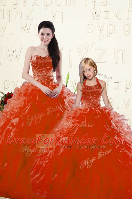 Long Sleeves Floor Length Beading and Ruffles Lace Up Sweet 16 Dresses with Red