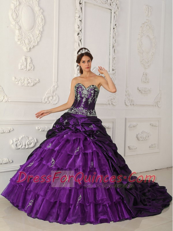 Purple Ball Gown Sweetheart Chapel Train Pretty Quinceanera Dresses with Taffeta and Organza Appliques