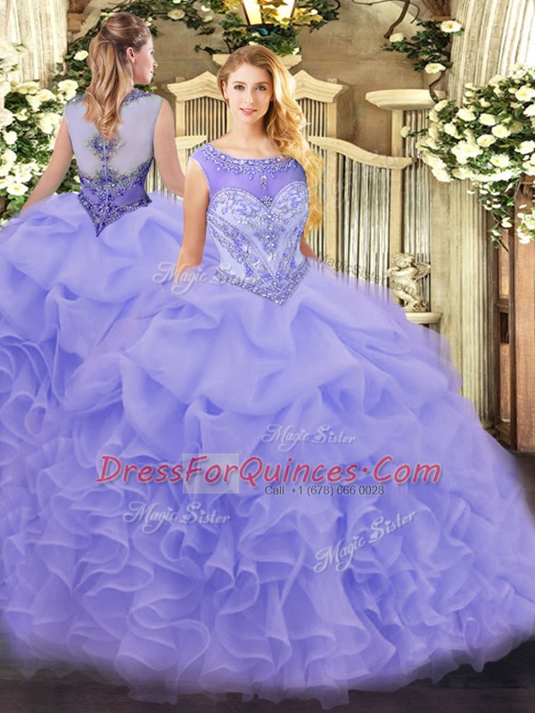 Sleeveless Organza Zipper Quince Ball Gowns in Lavender with Beading and Ruffles