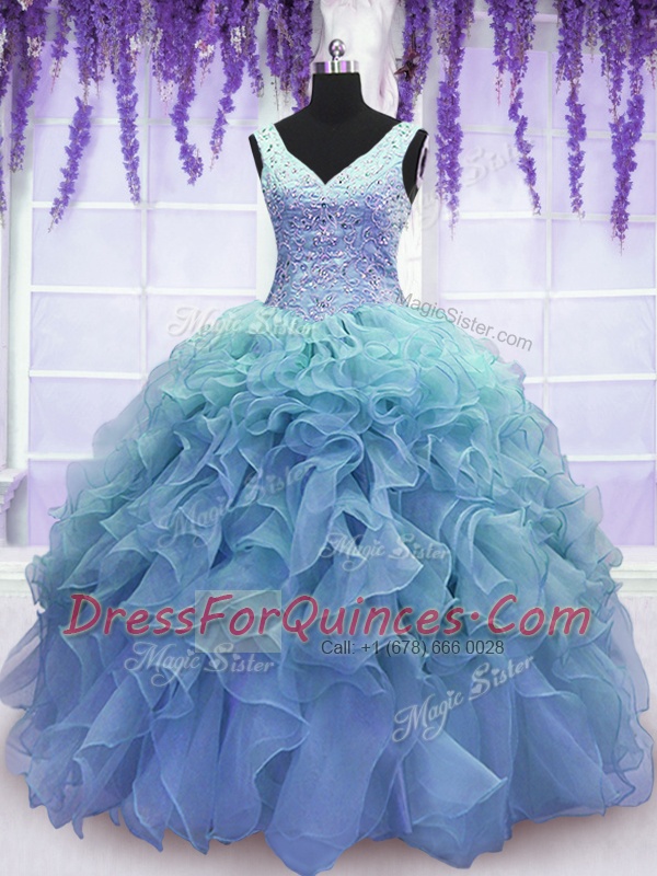 Spectacular Blue V-neck Neckline Beading and Embroidery and Ruffles Quinceanera Gowns Sleeveless Lace Up