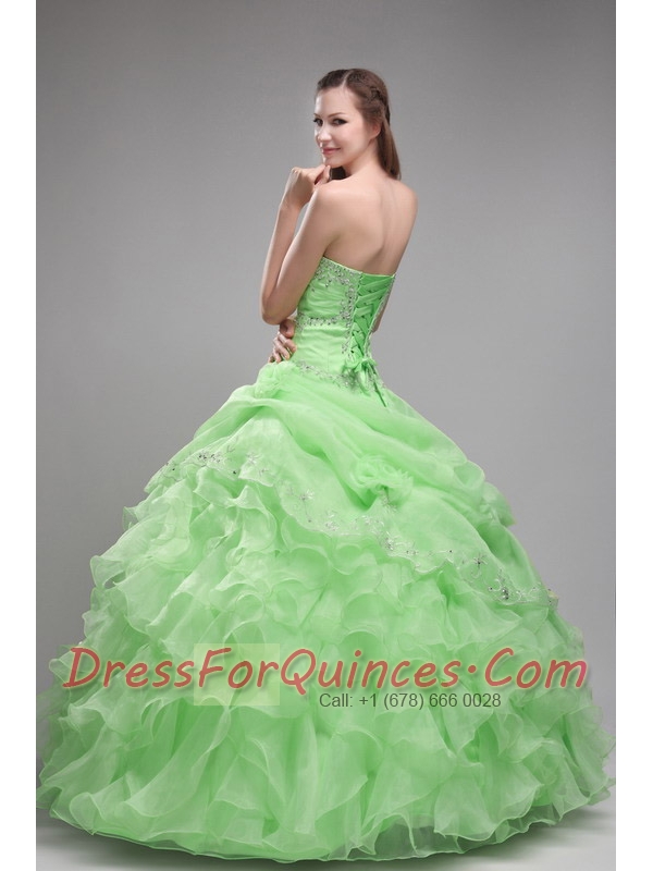 Spring Green Ball Gown Strapless Pretty Quinceanera Dresses with Orangza Beading and Ruffles