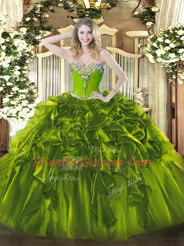 Sweetheart Sleeveless Ball Gown Prom Dress Floor Length Beading and Ruffles Olive Green Organza