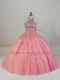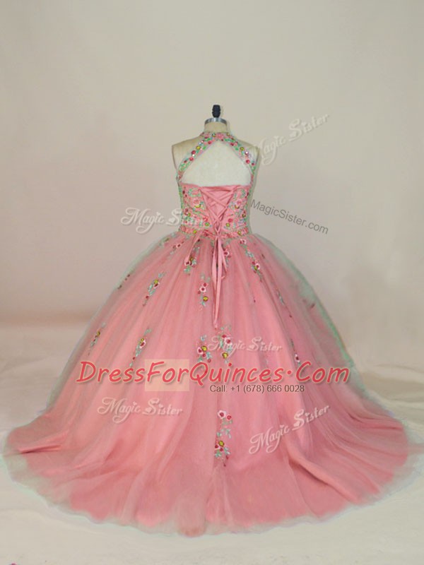 Tulle Halter Top Sleeveless Brush Train Lace Up Appliques and Embroidery Quinceanera Dresses in Pink