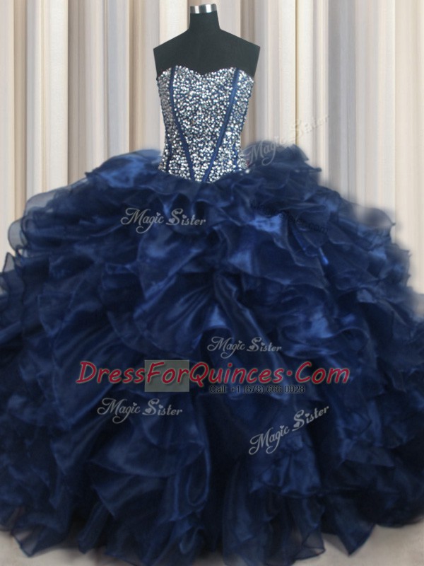 Unique Visible Boning Bling-bling Navy Blue Lace Up 15th Birthday Dress Beading and Ruffles Sleeveless With Brush Train