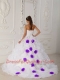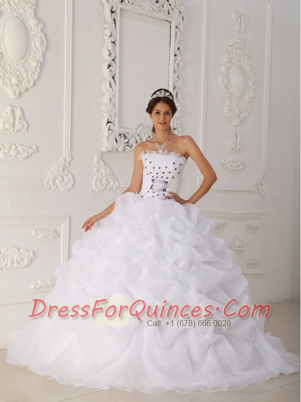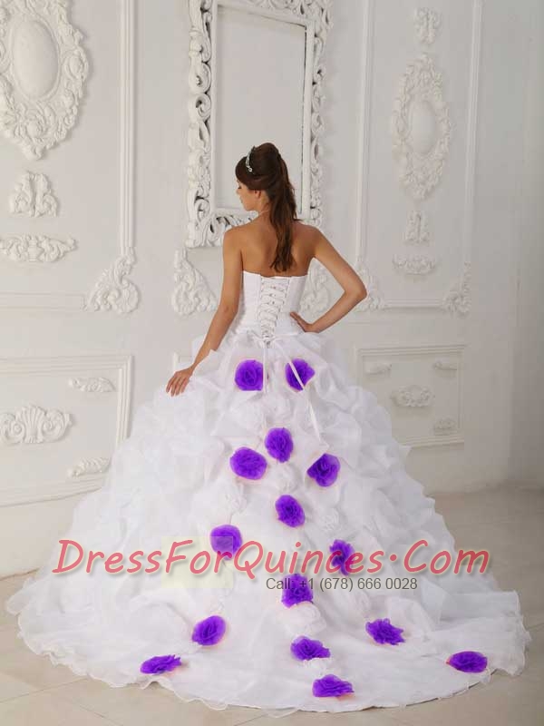 White Ball Gown Strapless Court Train Organza Beading and Hand Flower Pretty Quinceanera Dresses