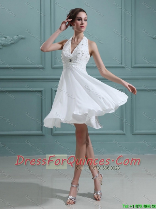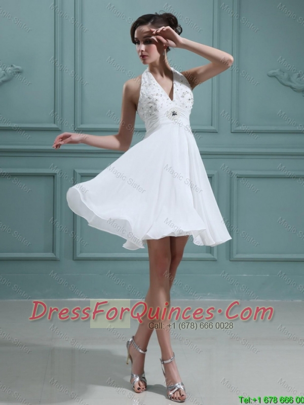 2016 Cheap Empire Halter Top White Prom Dresses with Beading