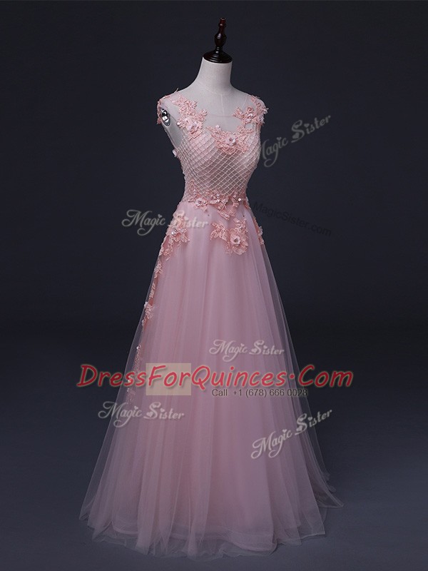 Artistic Baby Pink Sleeveless Tulle Lace Up Prom Gown for Prom and Party