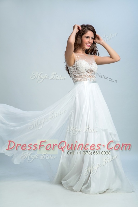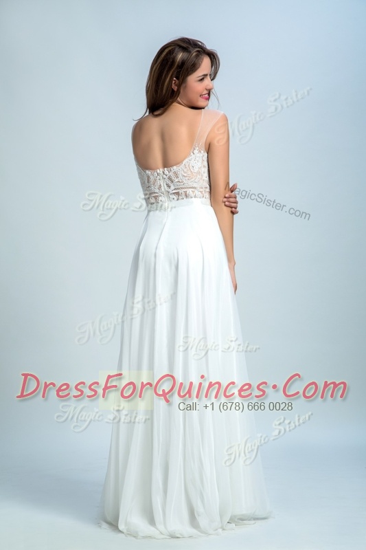 Bateau Sleeveless Dress for Prom Floor Length Lace White Tulle