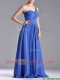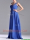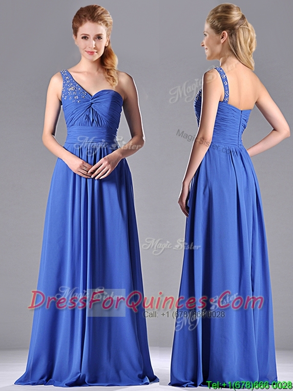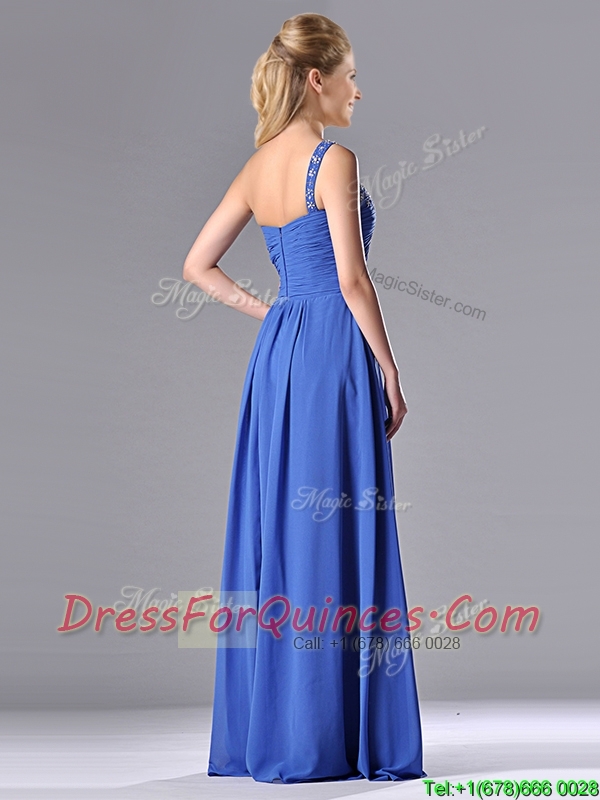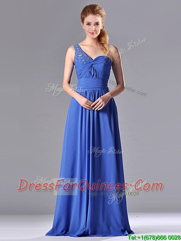 Column Chiffon Beading and Ruching Blue Prom Dress with One Shoulder