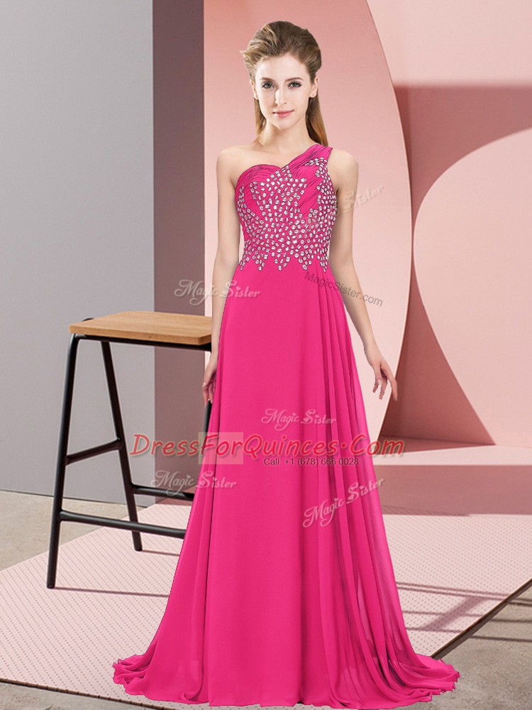 Empire Dress for Prom Hot Pink One Shoulder Chiffon Sleeveless Floor Length Side Zipper