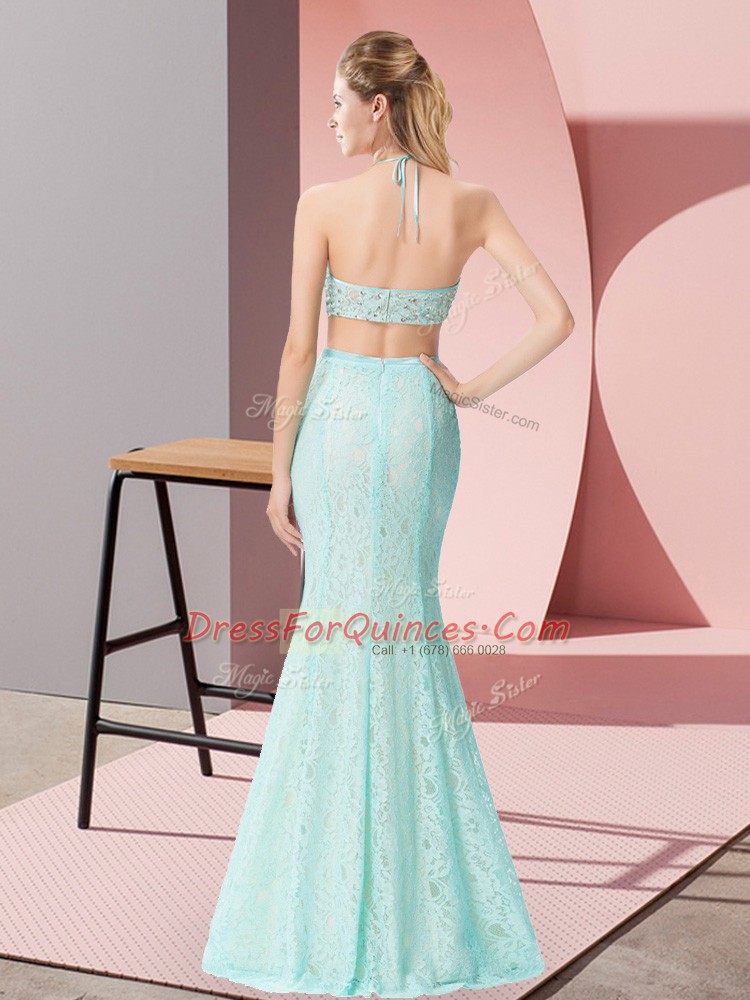 Enchanting Halter Top Sleeveless Backless Prom Gown Apple Green Lace