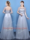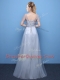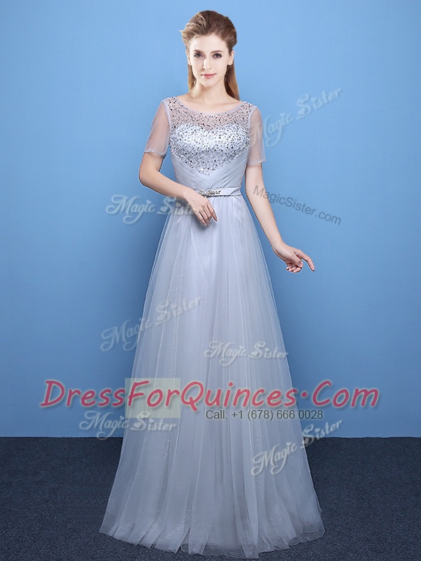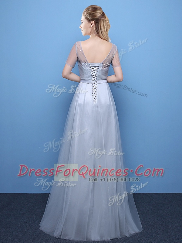 Enchanting Scoop Grey Lace Up Prom Evening Gown Beading Short Sleeves Floor Length