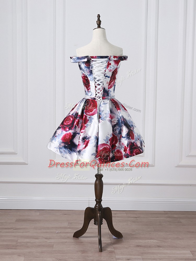 Exquisite A-line Dress for Prom Multi-color Off The Shoulder Printed Sleeveless Mini Length Lace Up