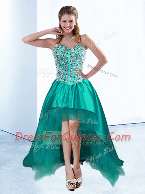 Fantastic Teal A-line Sweetheart Sleeveless Satin High Low Lace Up Beading and Bowknot Dress for Prom