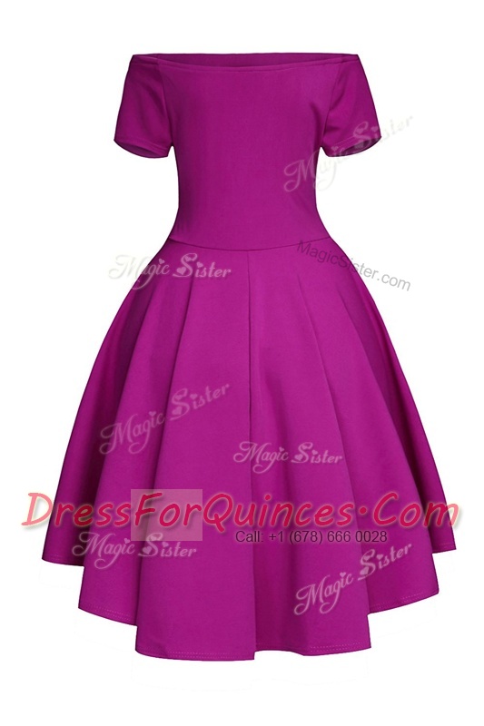 Inexpensive Ruching Prom Evening Gown Fuchsia Side Zipper Short Sleeves Tea Length