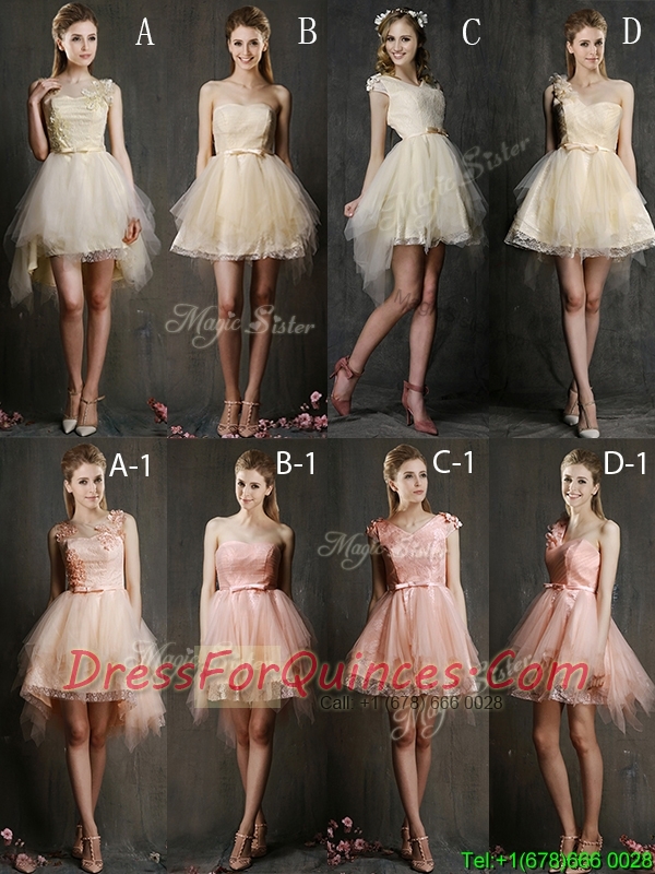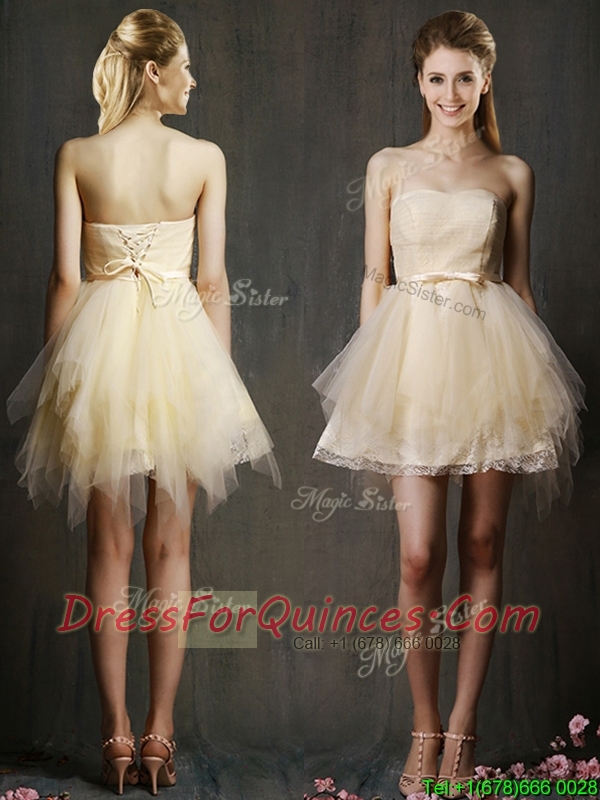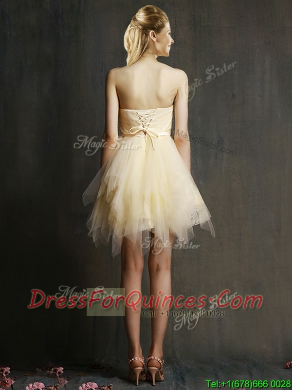 Lovely Sweetheart Short Champagne Prom Dresses with Belt and Ruffles