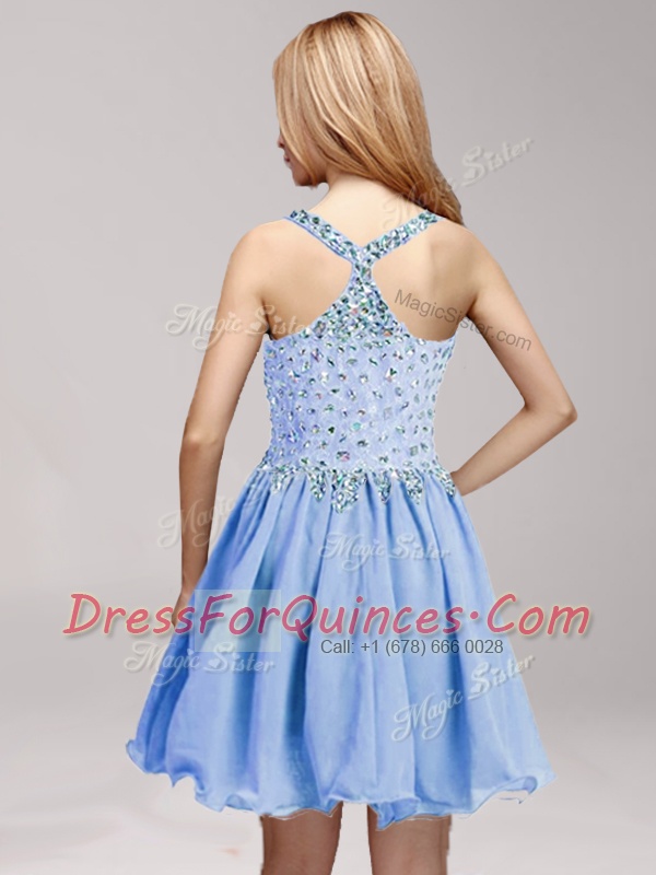 Mini Length Blue Evening Dress Straps Sleeveless Criss Cross