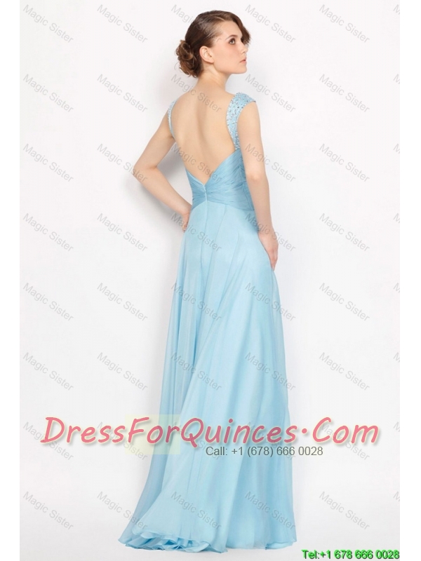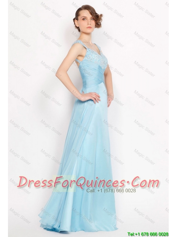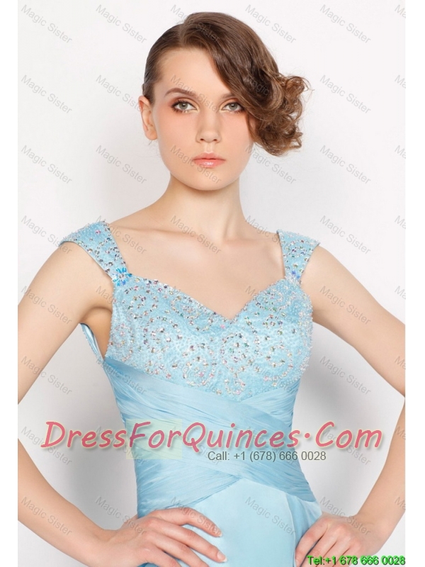 Perfect Straps Ruched Light Blue Prom Dresses with Beading