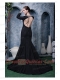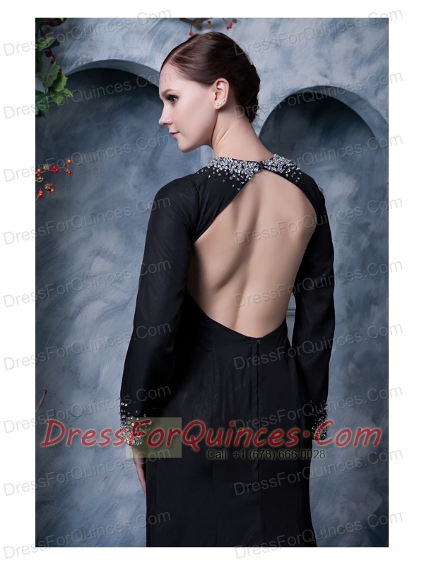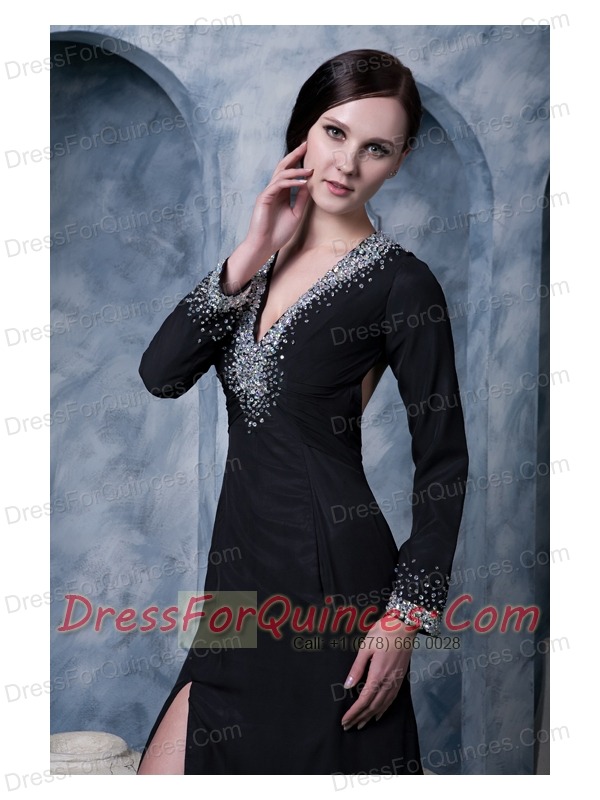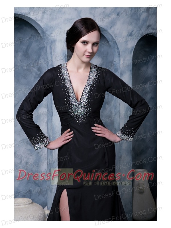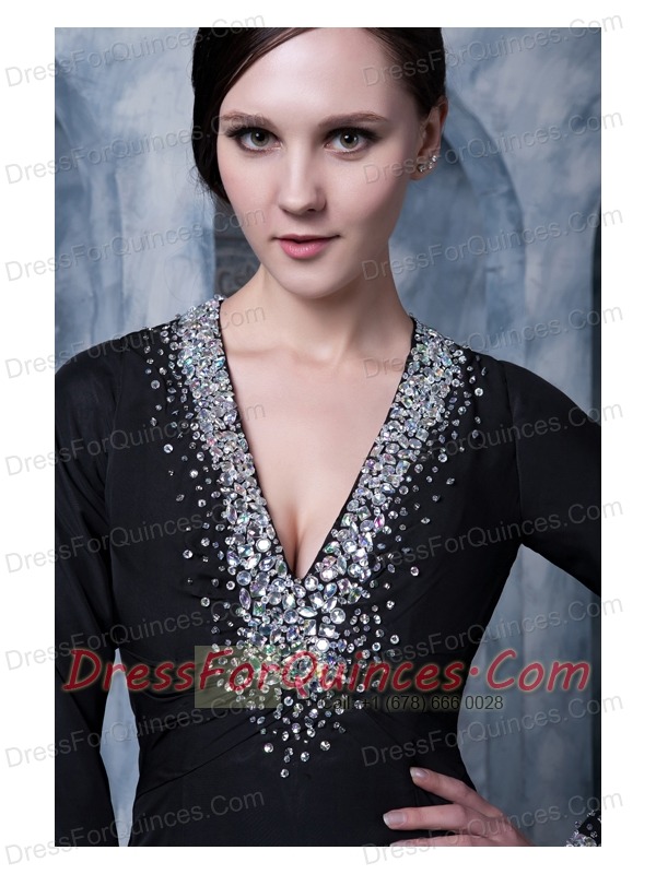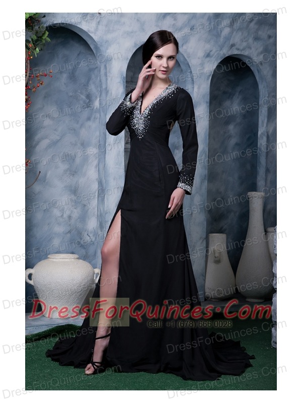 Prom Dress Black A-line V-neck Brush Train Chiffon Beading