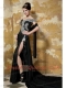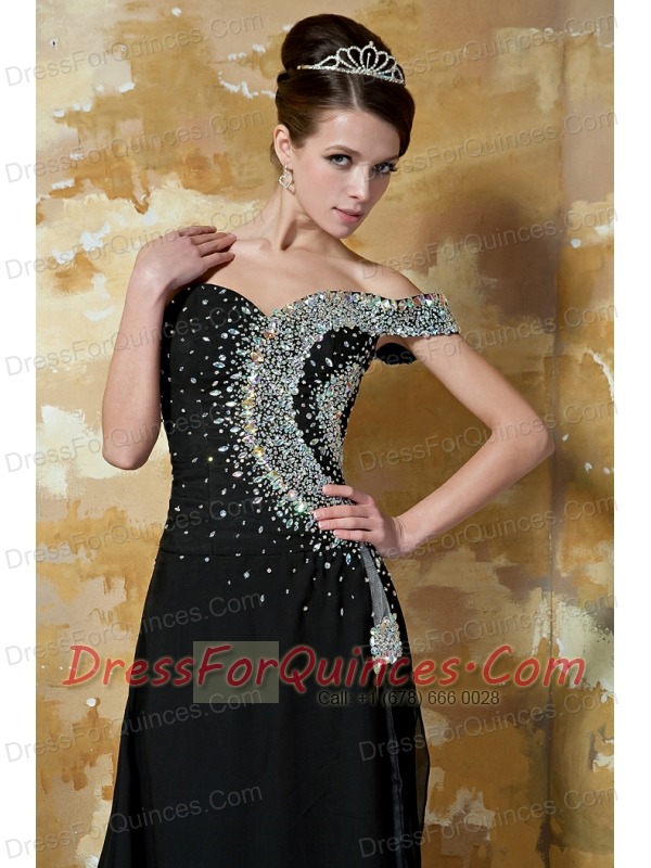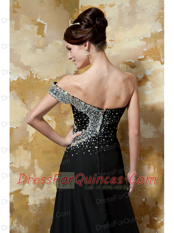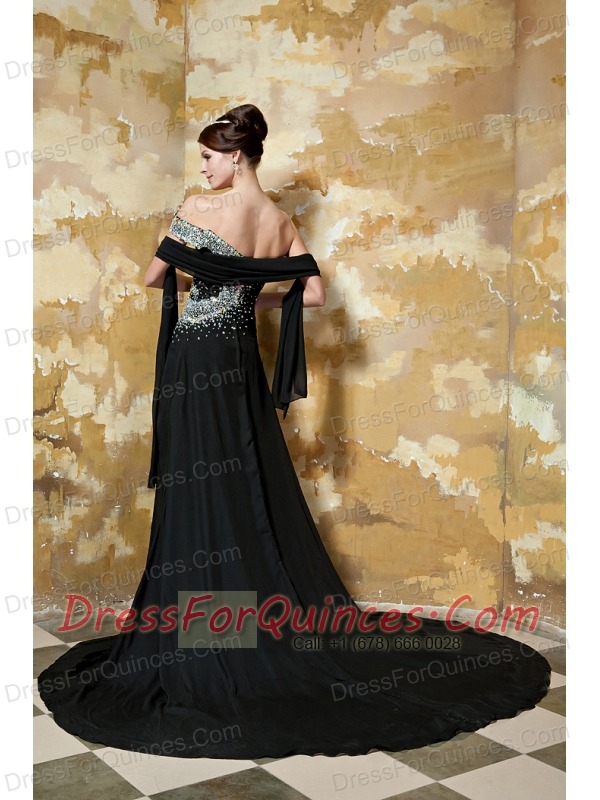 Prom Dress Black Column One Shoulder Chapel Train Chiffon Beading