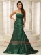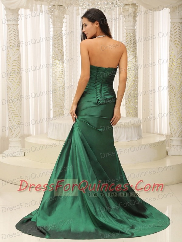 Prom Dress Dark Green Modest Ruched Bodice Brush Train Custom Made