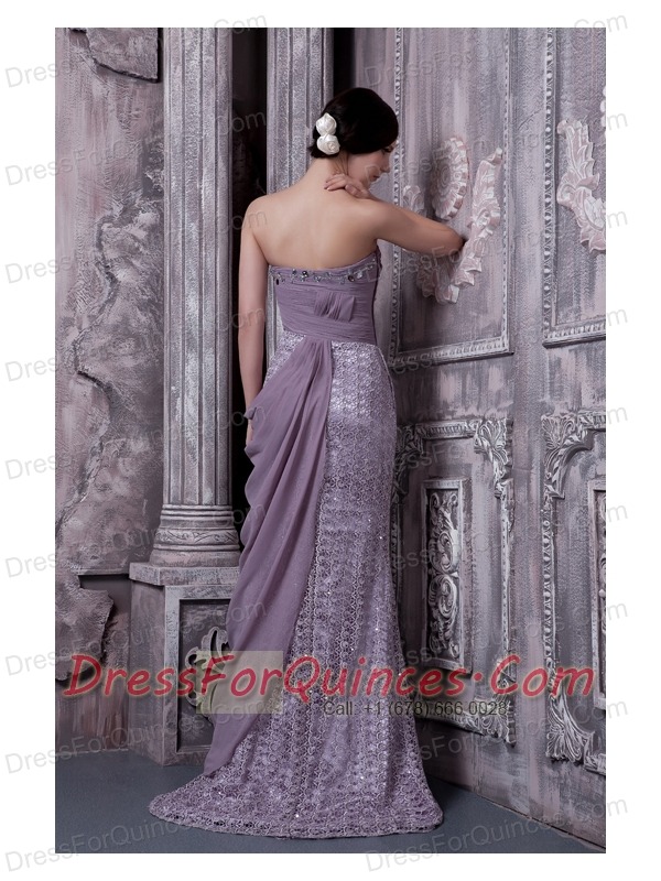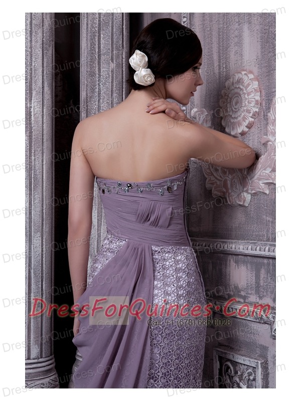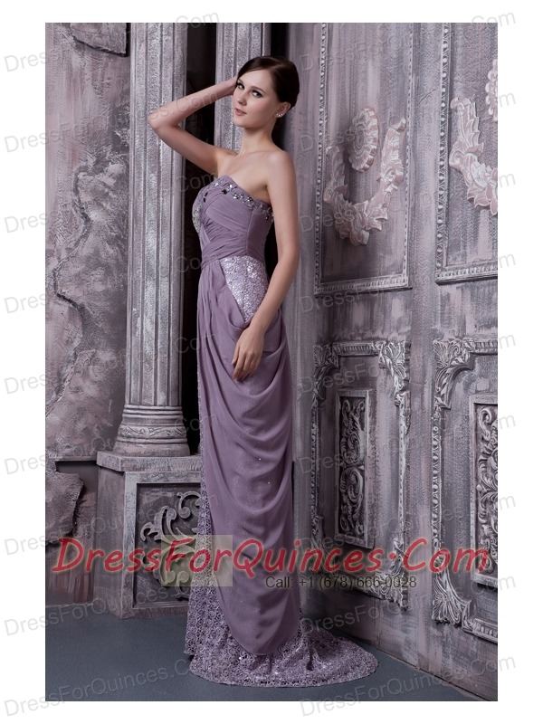 Prom Dress Lavender Column Sweetheart Brush Train Special Fabric and Chiffon Beading