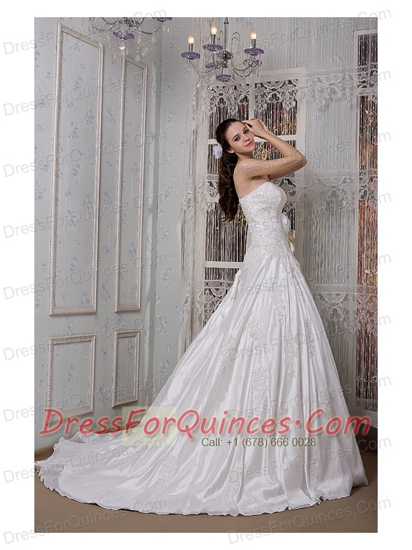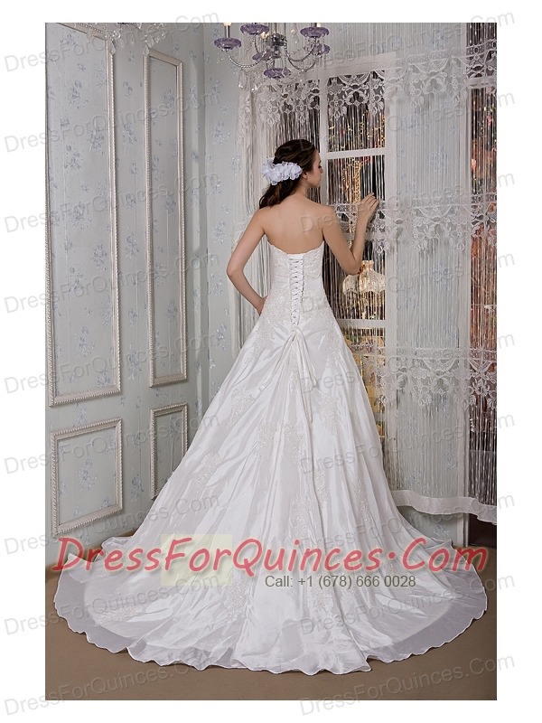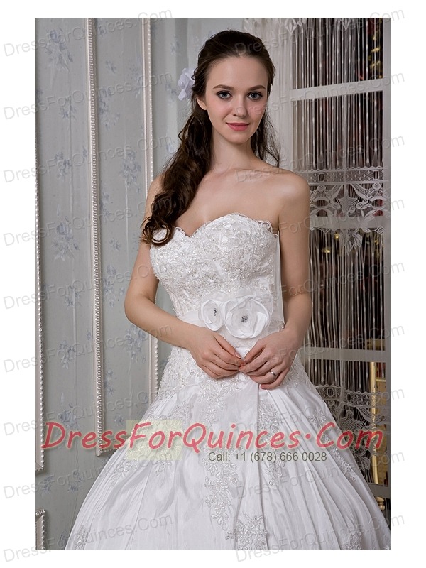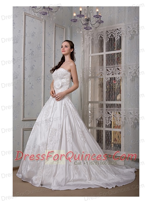 Prom Dress Modest A-line Sweetheart Brush Train Taffeta Appliques and Hand Made Flower