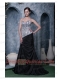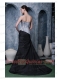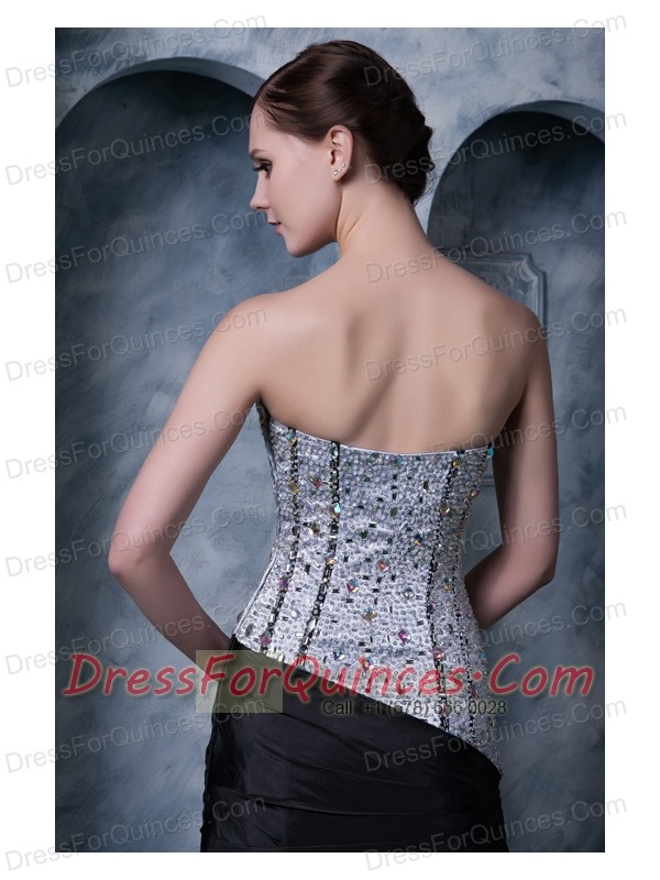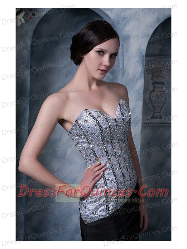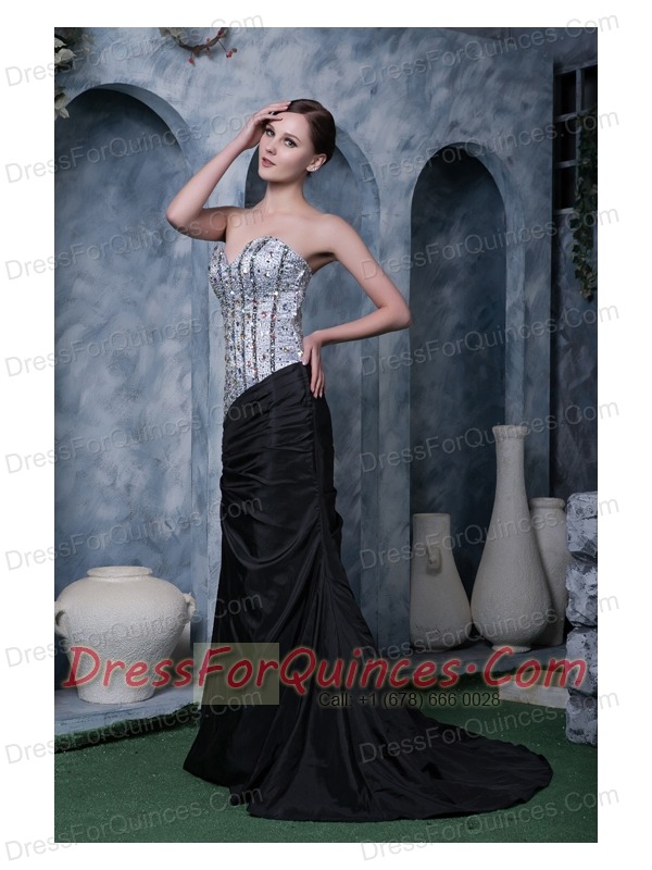 Prom Dress Sliver and Black A-line Sweetheart Brush Train Elastic Woven Satin Beading