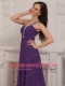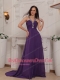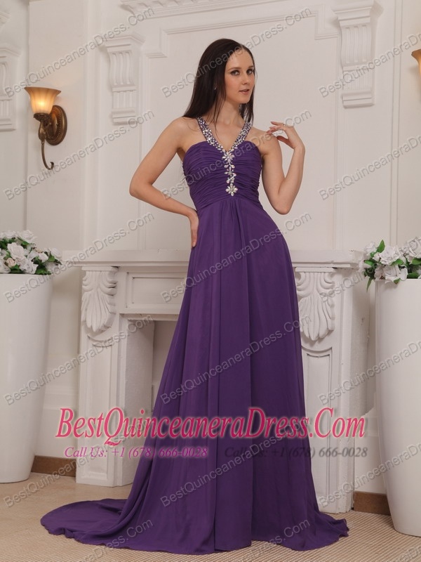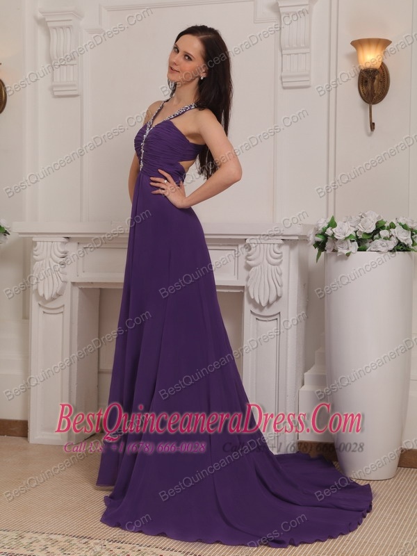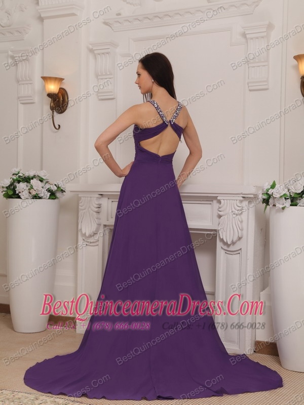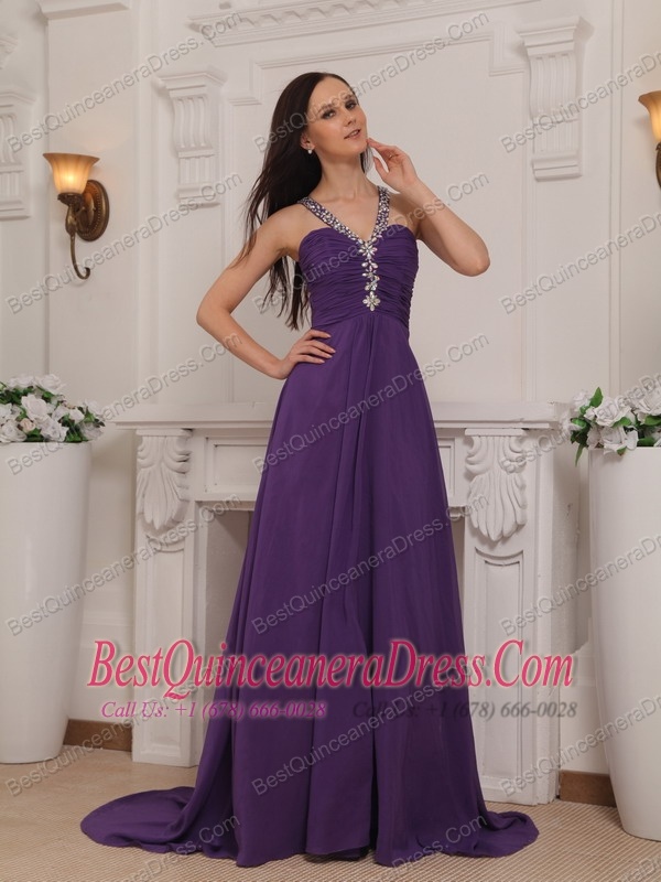 Purple Empire V-neck Brush Train Chiffon Beading and Ruch Prom / Pageant Dress