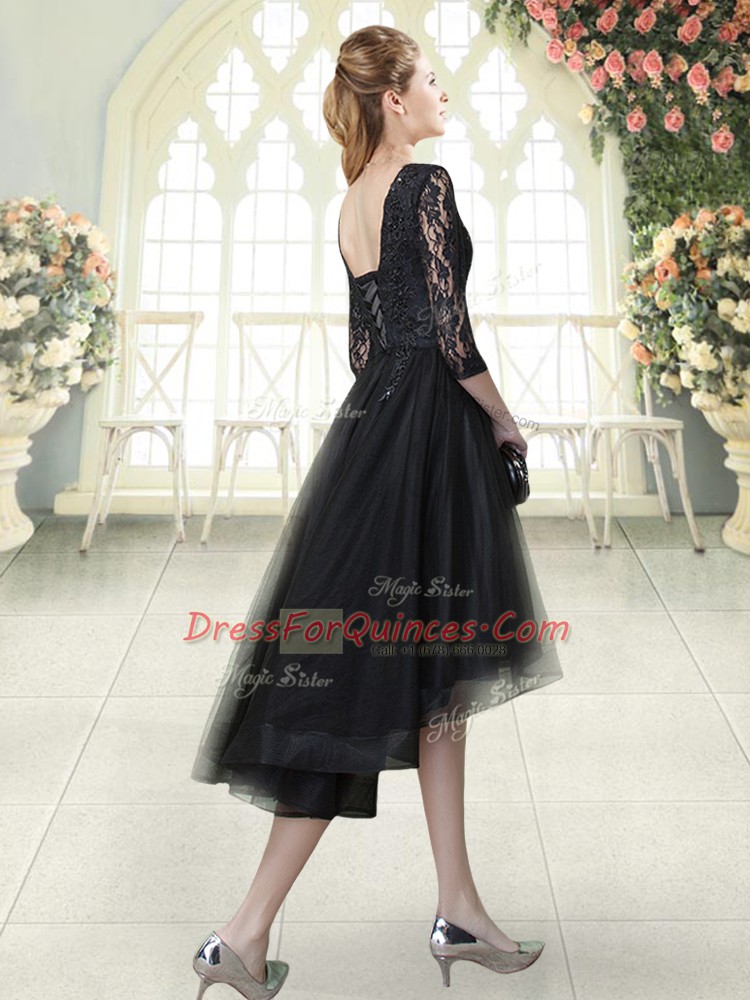 Stunning Black A-line Tulle Scoop Half Sleeves Lace High Low Lace Up Prom Gown