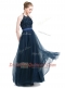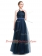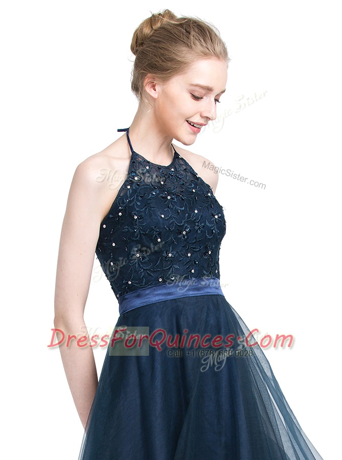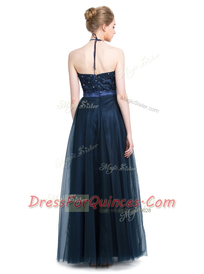 Unique Navy Blue Empire Tulle Halter Top Sleeveless Beading Floor Length Zipper Prom Dress