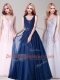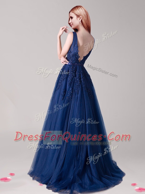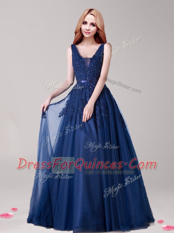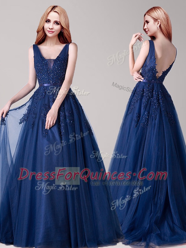 Wonderful Backless Floor Length Navy Blue Tulle Sleeveless Appliques and Belt