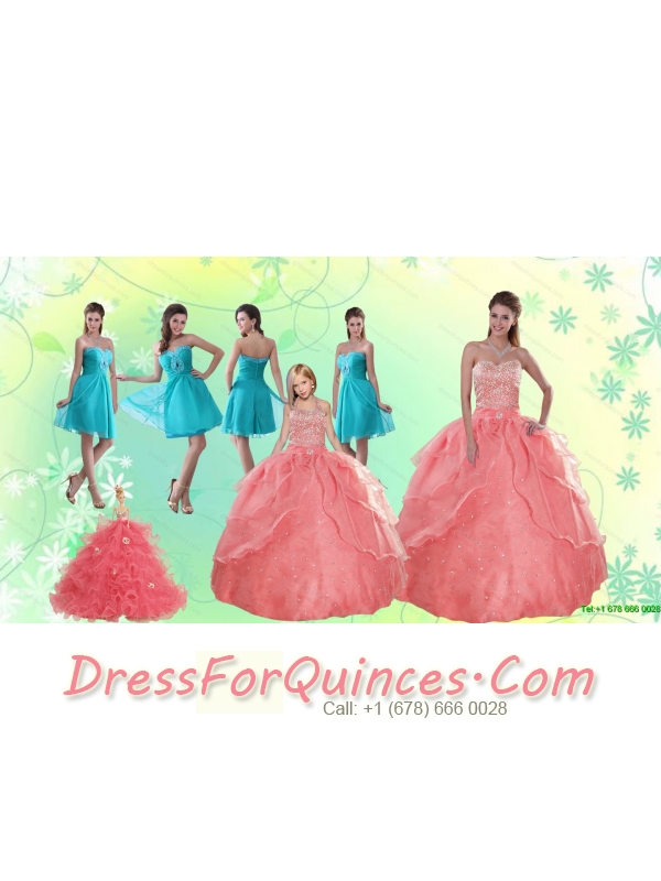 Beading Watermelon Quinceanera Gown and Baby Blue Short Dama Dresses and Halter Top Watermelon Little Girl Dress