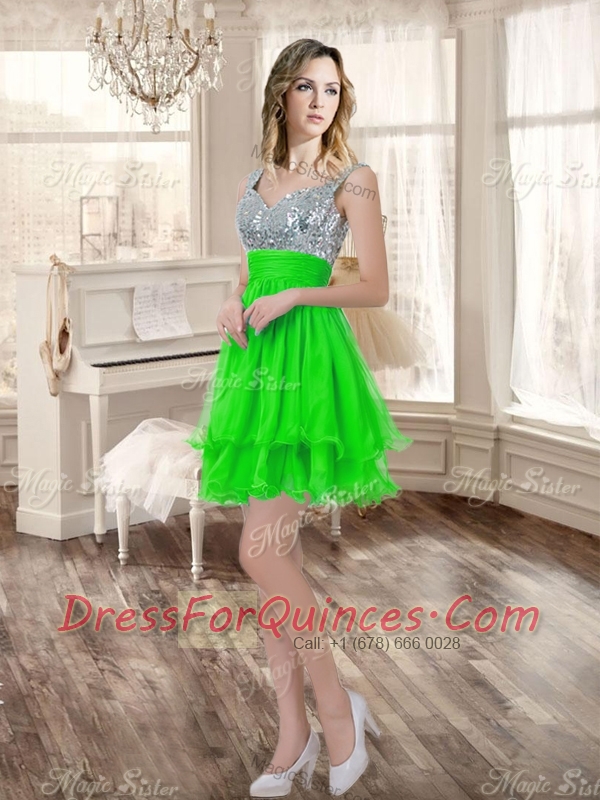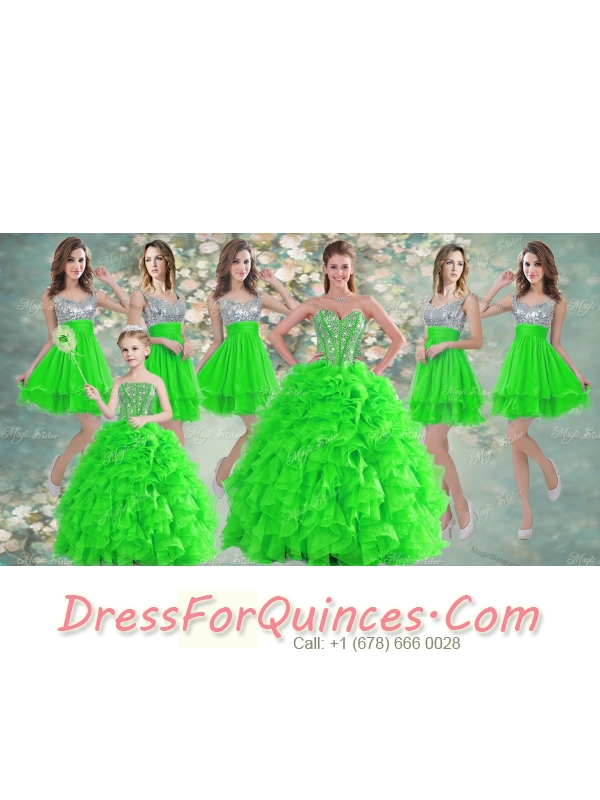 Really Puffy Spring Green Sweet 16 Dress and Sequined Short Dama Dresses and Beaded and Ruffled Mini Quinceanera Dress
