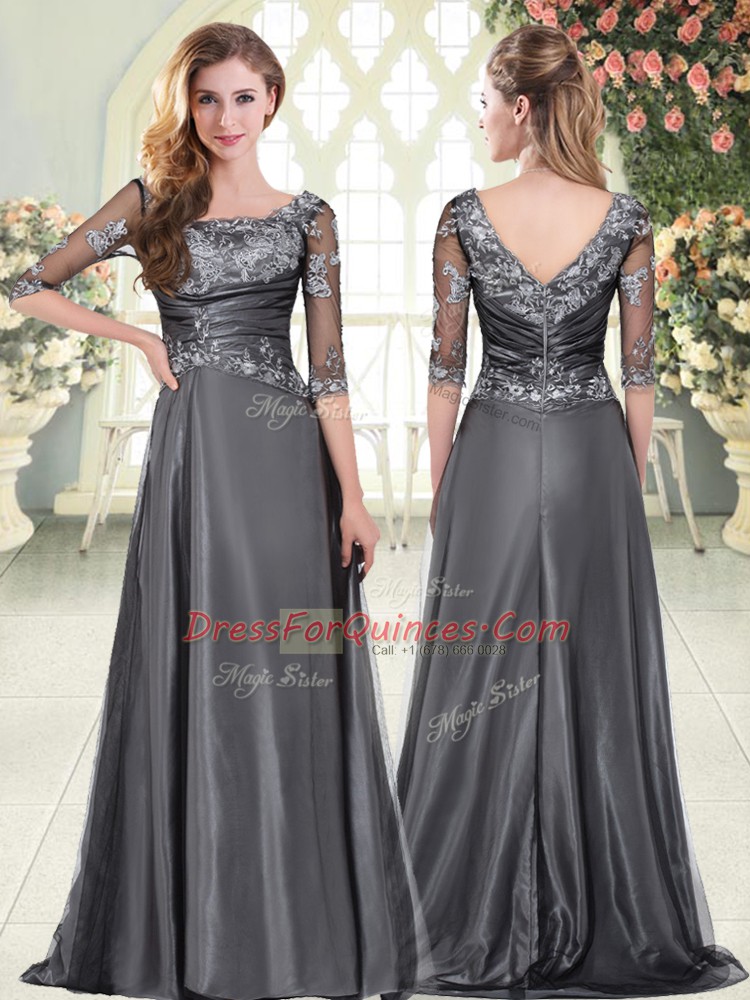 Cheap Grey A-line Taffeta Scalloped Half Sleeves Beading and Lace and Appliques Zipper Prom Evening Gown