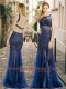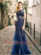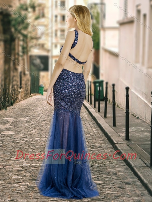 Column Square Beaded Backless Navy Blue Prom Dress in Tulle