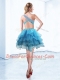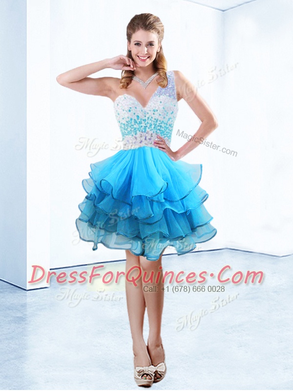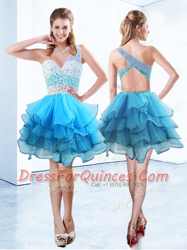 Designer One Shoulder Sleeveless Criss Cross Knee Length Beading and Ruffled Layers Prom Party Dress
